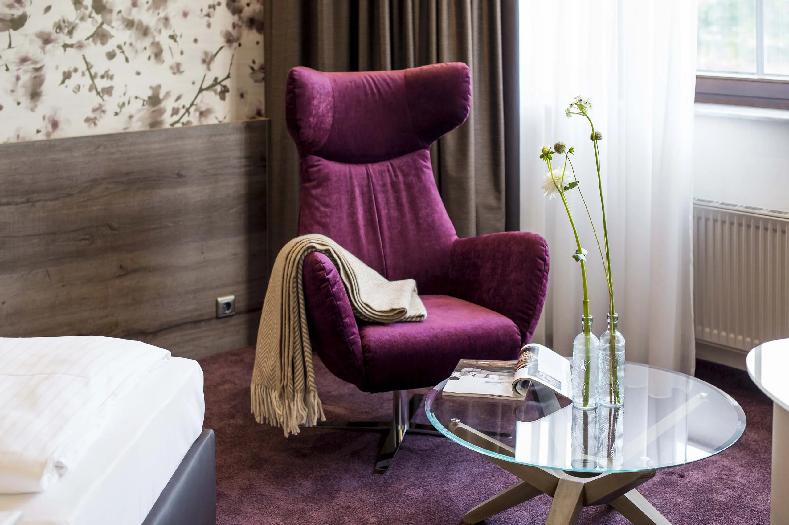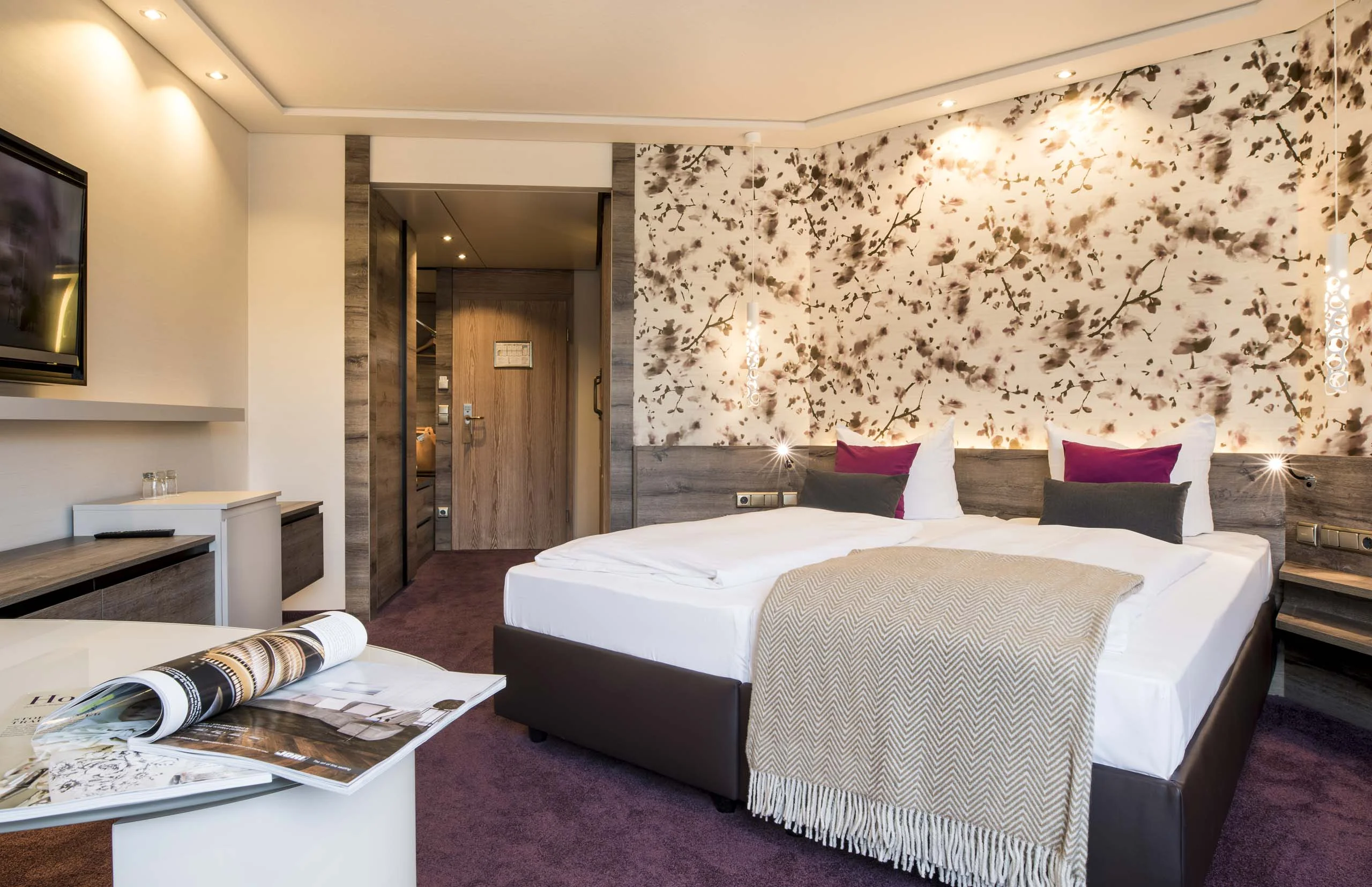 Stilvolle Suiten, teils mit architektonisch reizvoller Dachschräge. Der Wohn-/Schlafbereich ist offen konzipiert und dezent separiert.